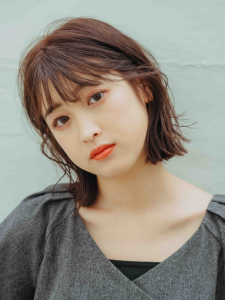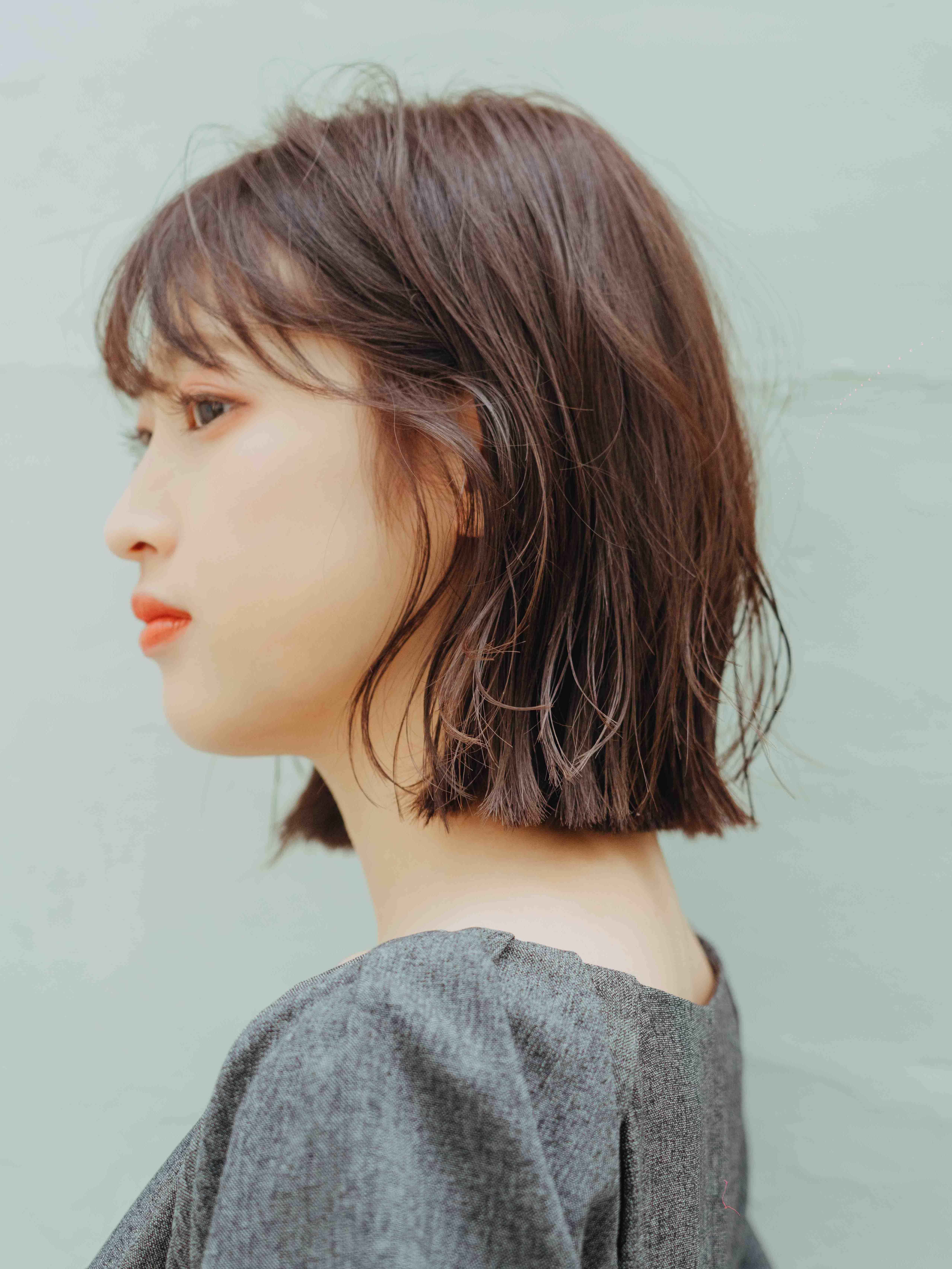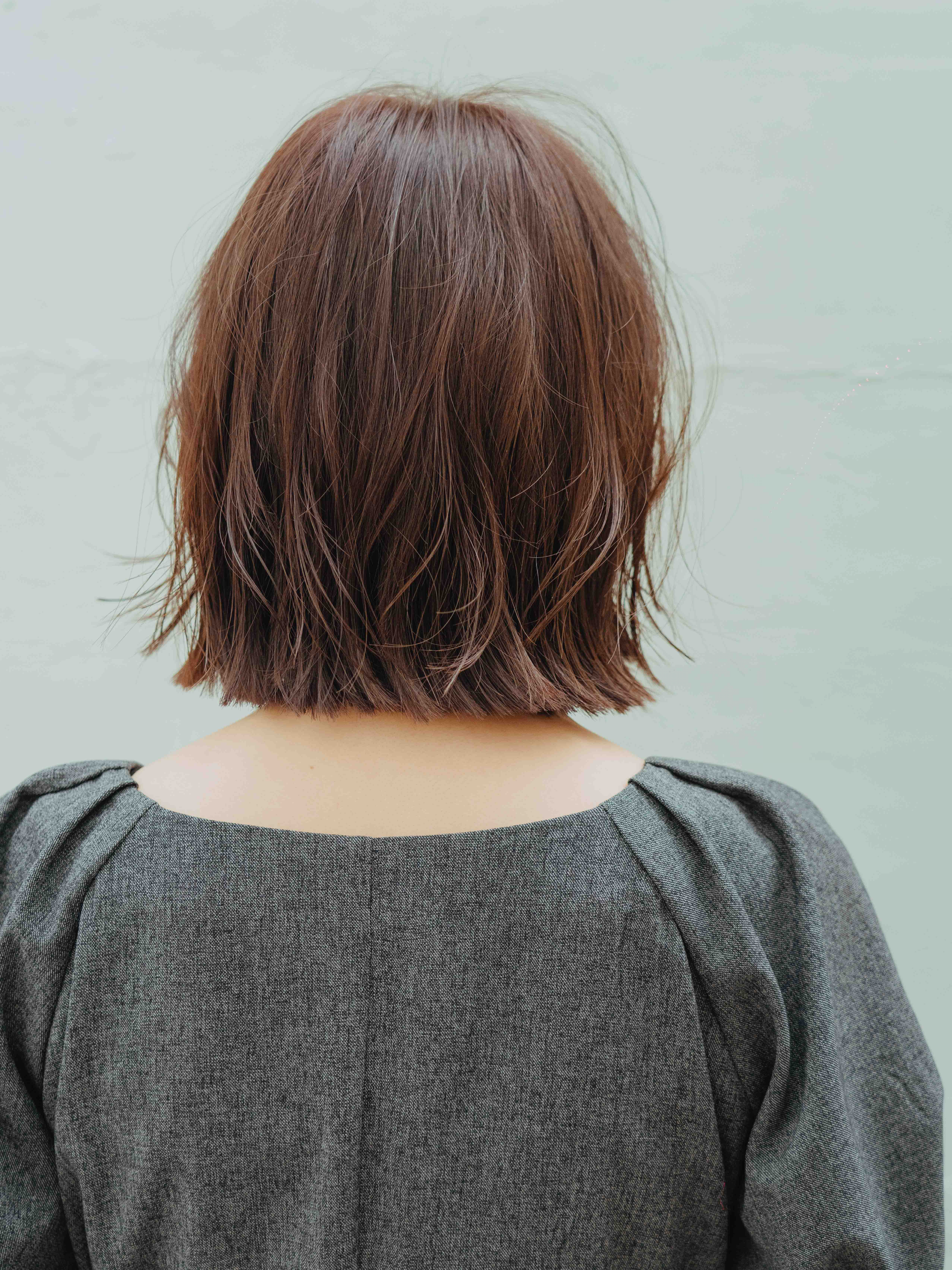 切りっぱなしのボブの表面に少しだけ動きが出るようにレイヤーが入っているスタイル!表面にレイヤーが入っているので、スタイリングの幅が広がります!またカラーも暖色系のブラウンになるので秋冬っぽい季節感のあるスタイルになっています。