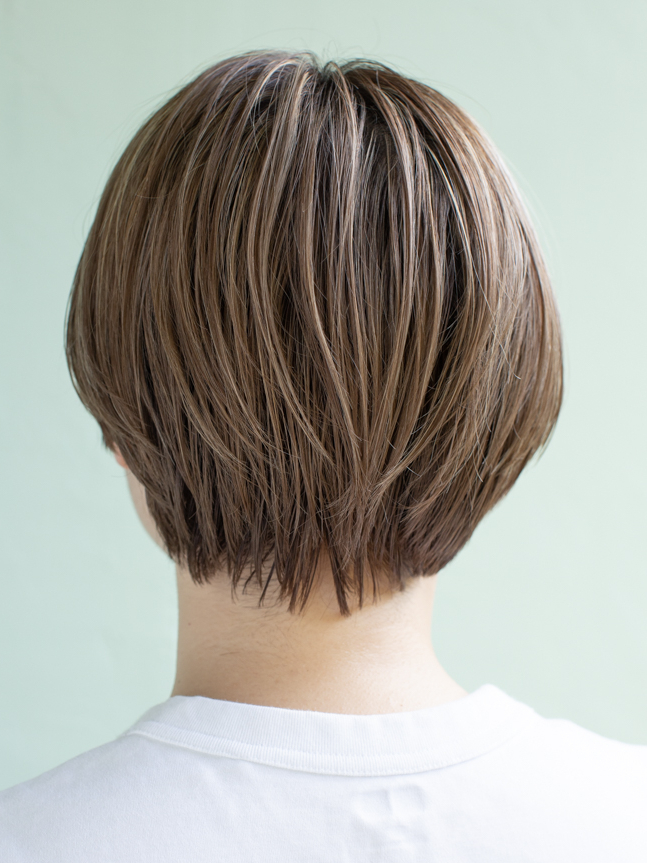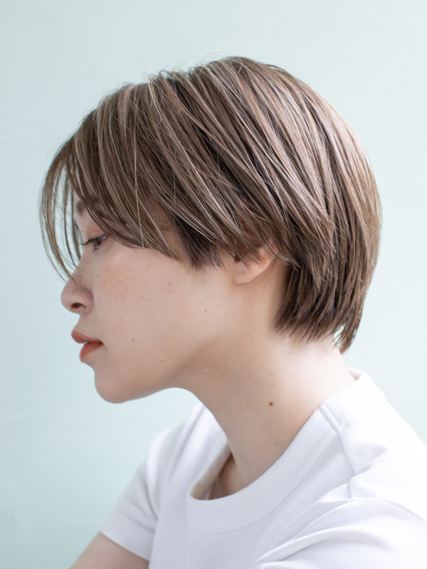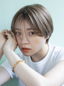 前髪は長めのシースルーバング。 顔まわりはぱつっとしたラインで、襟足はタイトなカットに仕上げています。 カラーはブリーチをして黄みを抑えたナチュラルなベージュに。 ウェット感がしっかり出るように中間と毛先中心にオイルをなじませました!